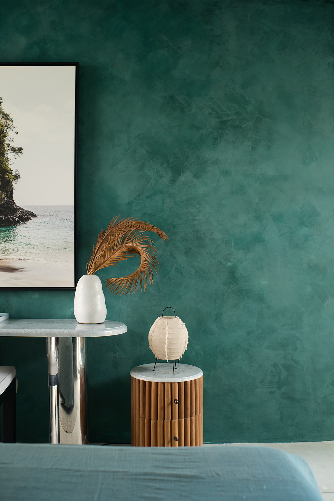 The absence of excessive styling is noticeable. Plants are minimal, bookshelves are not overfilled with relaxing room decor. In addition, the present decorative objects are kept geometric and low-gloss. The room isn’t trying to suggest a lifestyle; it’s built to support it. What the designer achieved here is a quiet, functioning system disguised as a bedroom. And that’s what makes it work. Throughout the process, Sharné provided alternate directions and ideas for the client to consider. One proposal leaned more tonal. Another brought in different light fixtures and a stronger contrast. These variations refined the client’s sense of what a relaxing bedroom design meant to them personally as much as stylistically. Ultimately, the chosen scheme found its strength in grounded accents— oversized artwork, sculptural side tables, and a mix of tactile finishes that feel both current and low-pressure.
